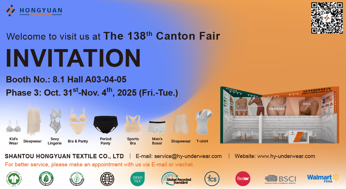 Hello! We are thrilled to announce that Hongyuan Underwear will participate in the 138th Canton Fair to showcase our newest B2B underwear solutions.